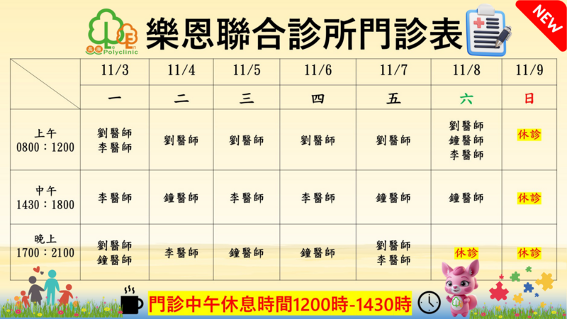 ★樂恩聯合診所衛教公告★📢預防腸病毒重症威脅,正確勤洗手& 接種腸病毒71型疫苗,一起守護您的寶貝健康╰(*°▽°*)╯❤️樂恩聯合診所關心您❤️ ★樂恩聯合診所衛教公告★📢預防肺炎黴漿菌感染123守則~(1)勤洗手、戴口罩(2)減少出入公共場所並保持社交距離(3)適當運動與均衡飲食增強免疫力 ❤️樂恩聯合診所關心您❤️ 🏥樂恩衛教快訊推播 📢好消息!衛生福利部國健署為提升兒童醫療照護,自113年7月1日起提供免費『兒童發展篩檢服務』,具健保身分之未滿7歲兒童,家長可依篩檢服務補助時程,至本院接受兒童發展篩檢服務~詳情歡迎向樂恩聯合診所門診護理師諮詢~❤️樂恩聯合診所關心您❤️ 🏥 樂恩衛教快訊📢面對肺炎鏈球菌病毒威脅~健康保衛戰首選 『15價肺炎鏈球菌疫苗是您最好的選擇』👍 🩺樂恩衛教快訊推播📢三價防護,一針安心~保護自己,也保護家人,接種流感疫苗最安心!本院即日起開放三價自費流感疫苗預約~💉疫苗諮詢專線☎️06-6331666~樂恩聯合診所關心您❤️❤️❤️ 樂恩聯合診所衛教快訊🩺預防流感~疫苗護航💉本院114年(東洋細胞型、賽諾菲、葛蘭素)自費流感疫苗全數到貨囉~早接種、早安心~樂恩陪您一起守護最愛的家人~自費流感疫苗諮詢專線06-6331666~樂恩聯合診所關心您❤️❤️❤️ 🏥樂恩衛教快訊推播📢流感季節來臨,保護心愛家人健康不能等最新鼻噴式流感疫苗是針對2歲以上孩童接種疫苗溫和新選擇~💉鼻噴式流感疫苗詳情衛教資訊歡迎來電門診櫃台06-6331666諮詢,樂恩聯合診所關心您❤️❤️❤️ 🩺樂恩聯合診所醫師門診異動公告📢本院劉維穆醫師114年10月29日星期三至11月2日星期日『全天門診休診』,詳情門診資訊歡迎參考樂恩LINE官網醫師門診表,謝謝! 好消息!好消息!本院猛健樂多劑量注射筆到院囉~想了解關於猛健樂更多衛教資訊,歡迎來電樂恩門診櫃台06-6331666諮詢,樂恩聯合診所關心您❤️❤️❤️