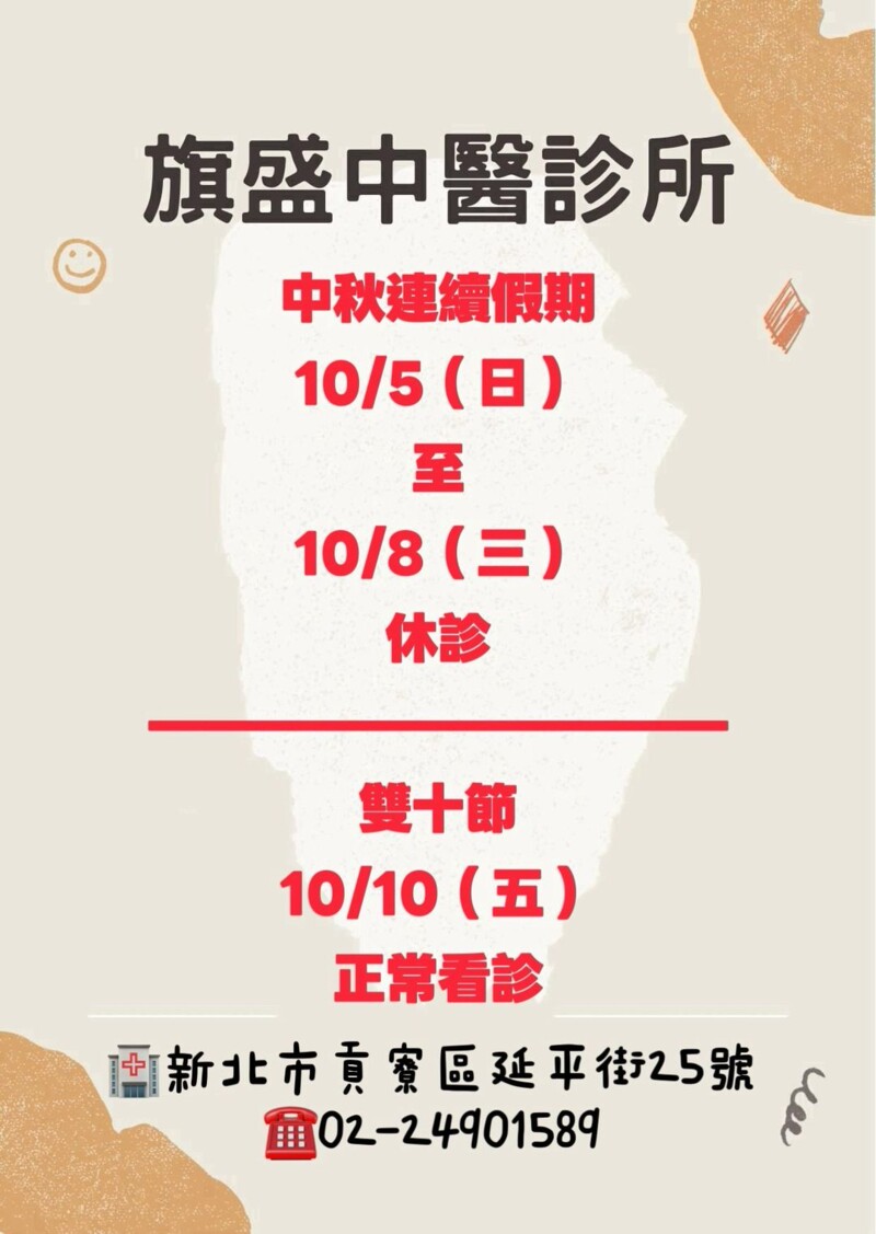 中秋連續假期10/5(日) ~ 10/08(三 ) 休診!!! 10/10(五)正常看診!!