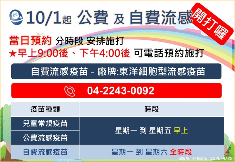❗❗公告❗❗ 10/22(三)早.午蘇醫師看診,晚上休診 & 10/25(六)休診& 10/1起,公費及自費流感開打了,歡迎來電洽詢 &,楊醫師小兒科診所 關心您!🥰🥰🥰🥰🥰