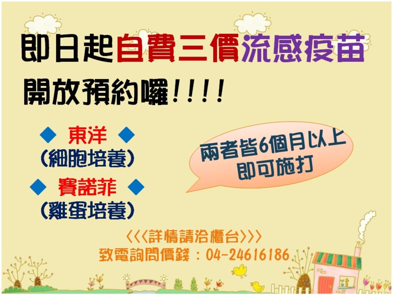 🎉 114年度自費流感疫苗即將售罄,若有接種流感疫苗的需求,請於門診時間現場訂購,謝謝。 🎉