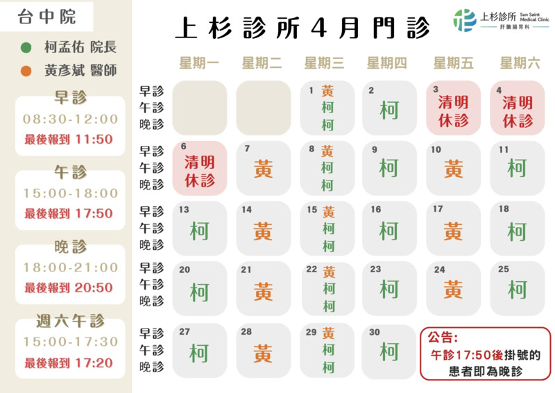 門診表: (預約 或是 現場掛號 *關診前30分鐘 請先前來報到*)