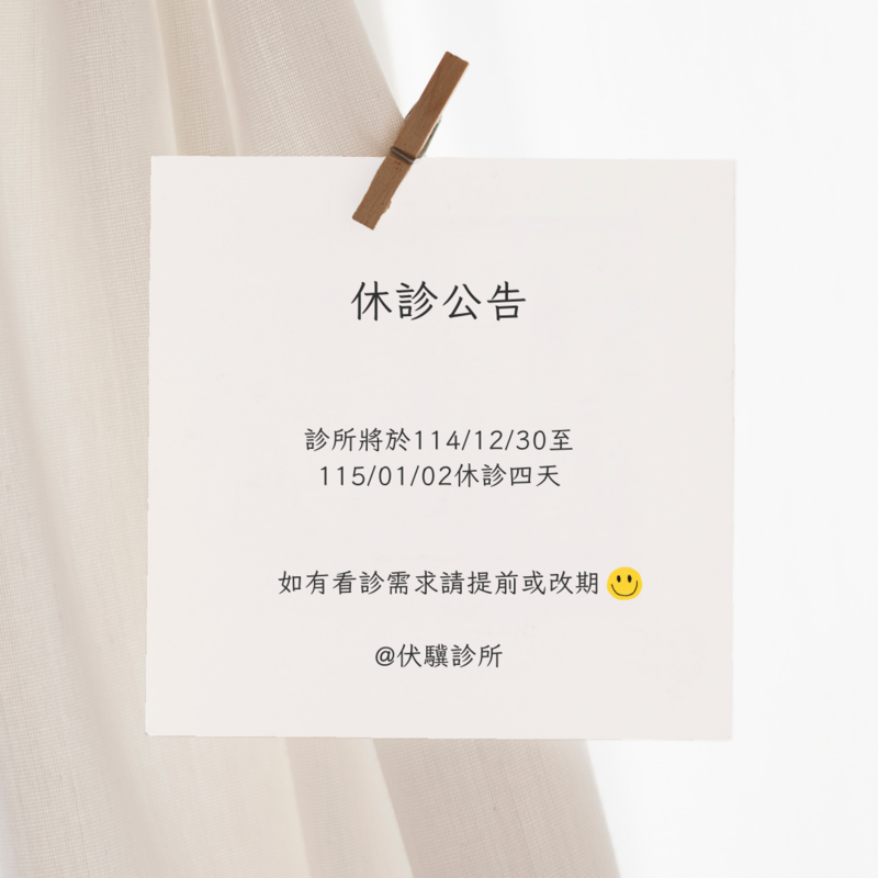 伏驥診所於2025/12/30 至 2026/01/02年度公休,於一月三日 (週六)恢復正常看診。造成不便敬請海涵!