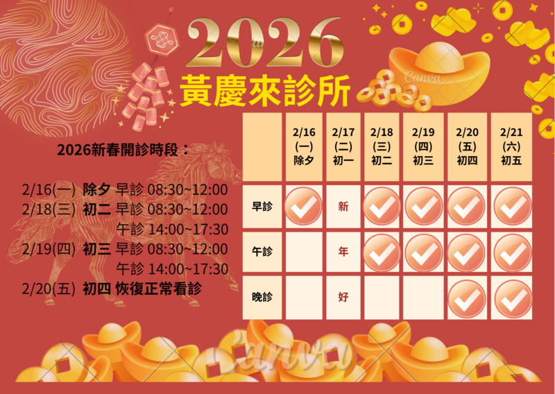 迎接馬年,特增除夕/初二/初三診次如下,如有需求之民眾請多加利用: