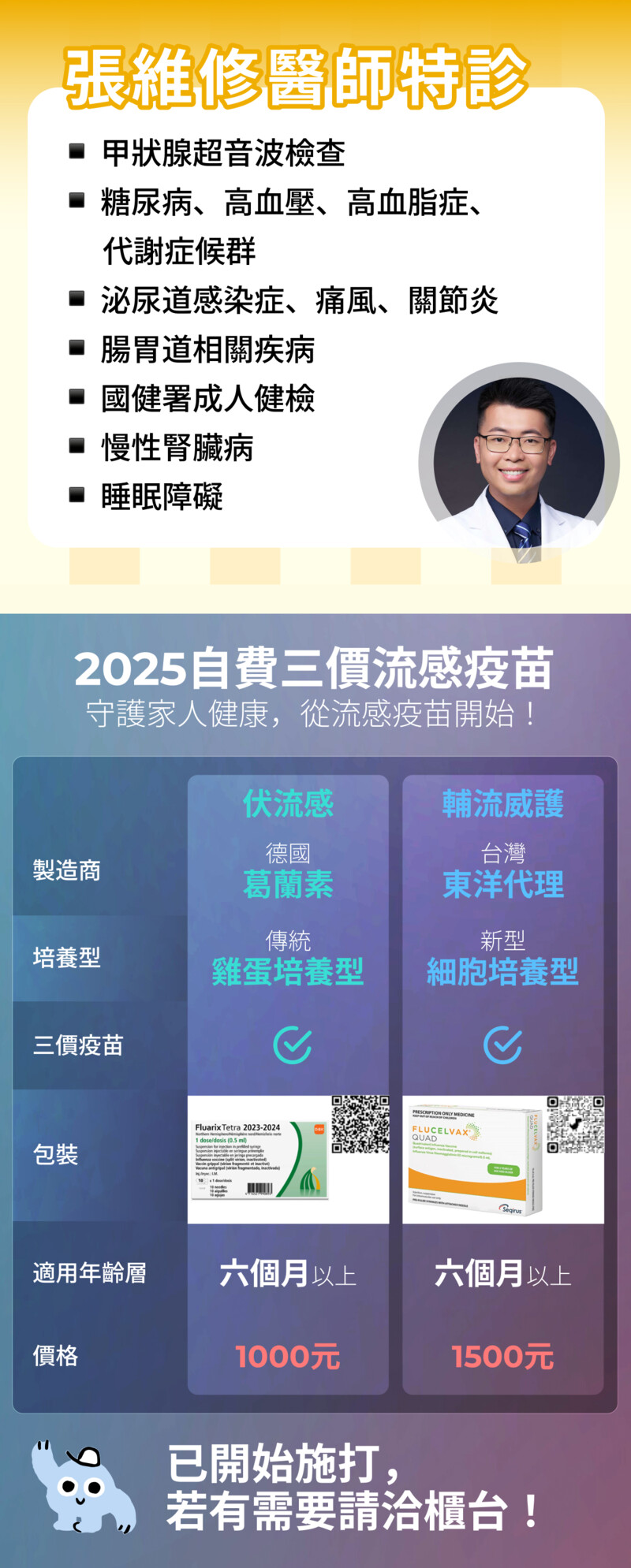 ☺️「喜樂的心 乃是良藥」☺️ 👍好消息,本院特聘張維修醫師加入服務陣容,自十月份開始看診。詳見下方醫師介紹。👍 😀自費流感疫苗開始施打,詳見下方訊息。近日流感流行提早升溫,建議及早施打預防感染。😀 👉LINE搜尋 ""叫叫我"" ,進入後搜尋 ""詮順"",點選一診或二診,再點選綠色 "詮順耳鼻喉科診所"" 即可進入本頁。👈