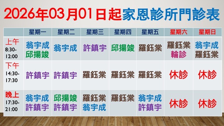 『年滿30歲免費成人健檢!!』、『ㄧ生一次B、C型肝炎免費篩檢』、『小兒預防疫苗施打』、『口腔篩檢』、『戒菸門診』、