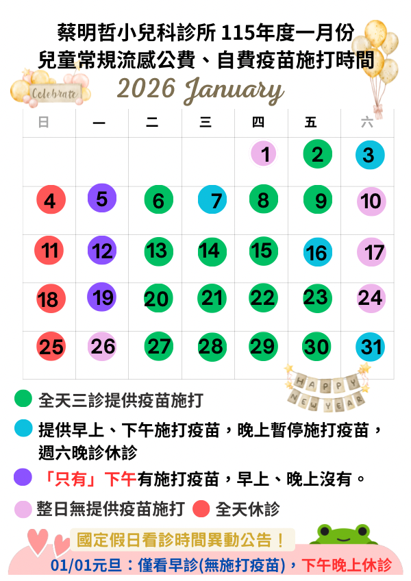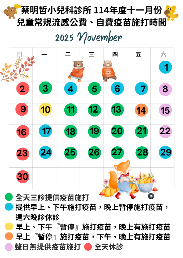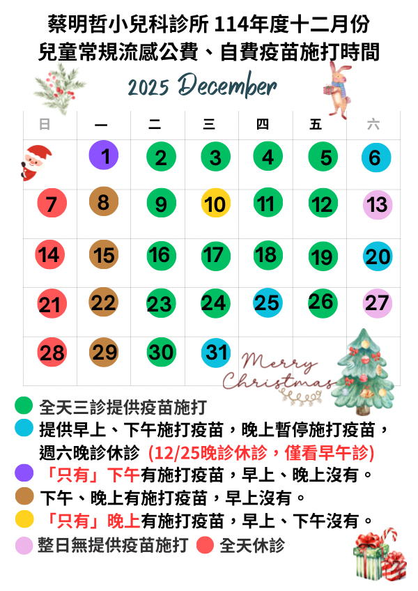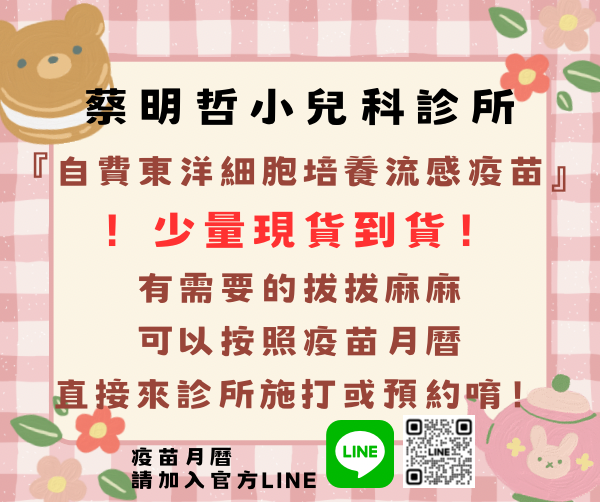 ✨自費東洋細胞培養流感疫苗熱烈施打中!✨114年公費流感疫苗『第一階段對象』10/01開打中!!✨電話預約請撥04-23338728✨現場掛號如遇預約人數較多需等候,可多加利用看診進度查詢,快到前6號請至現場等候,若遇過號人數較多需等候敬請見諒🙏 ✨預約掛號請提前6號報到並量體溫繳交健保卡才算完成報到。‼️若報到時已過號請看下方排序規則‼️ ⚠️有預約請注意最晚報到時間(請下拉網頁看時間表格),超過時間將自動取消預約。✅加官方LINE內建看診進度查詢。 ✅施打兒童常規疫苗請於有施打疫苗的診次(下拉網頁有疫苗月曆),並攜帶兒童手冊及健保卡報到,若需電話預約請告知要施打疫苗。