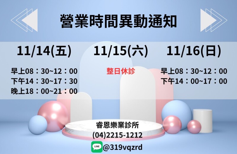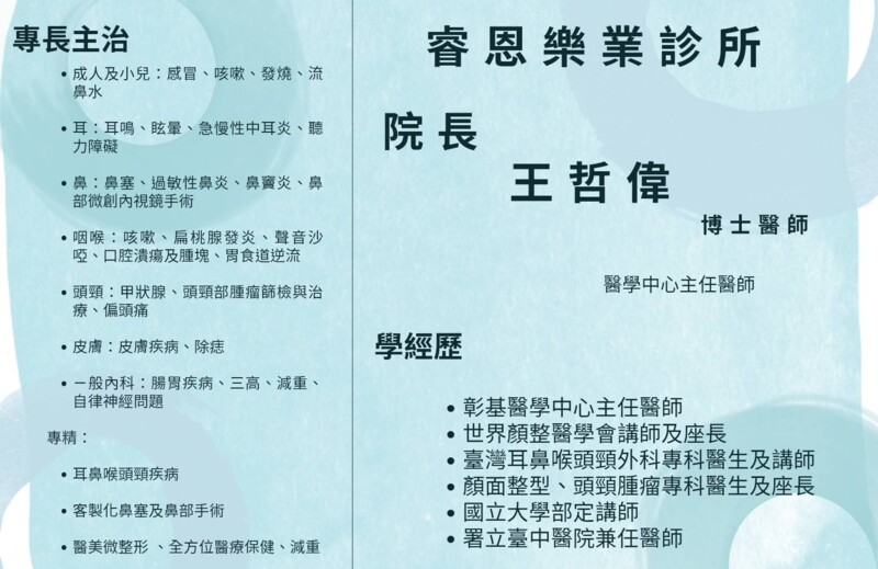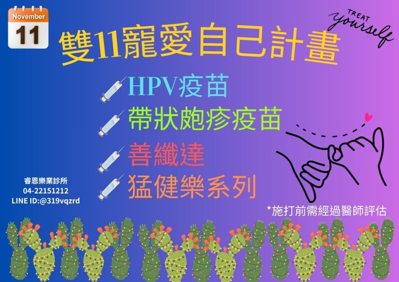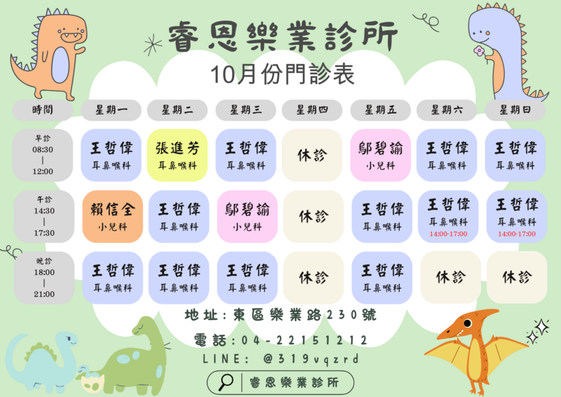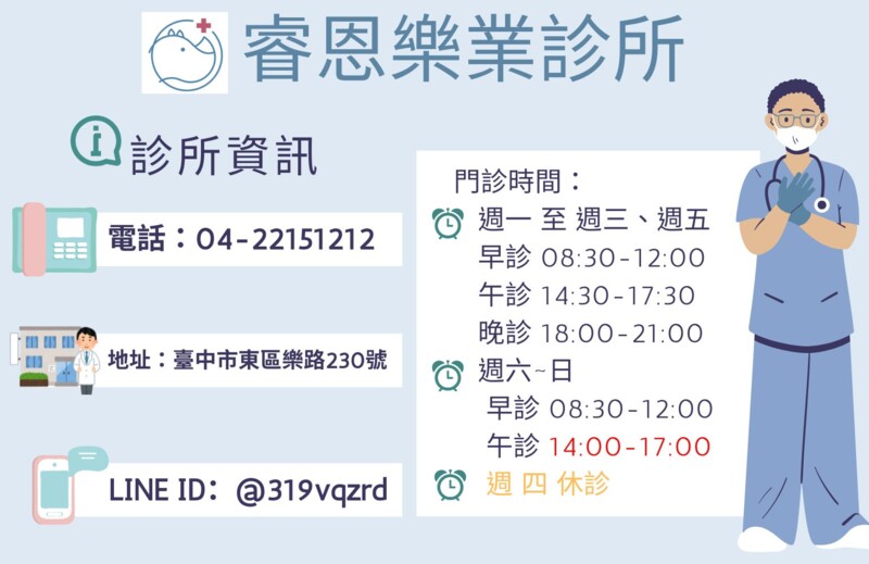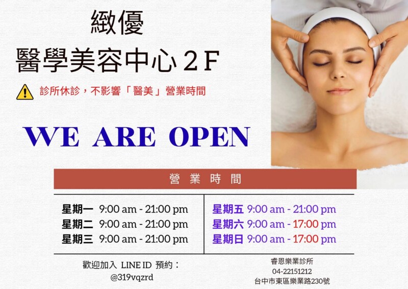 睿恩樂業診所 週六、日皆有醫師看診 歡迎入內看診~~ 一樓:本院提供全方位專業醫療服務,服務內容包含耳鼻喉、 頭頸、兒科方面、皮膚疾病、減重、除痣、客製化鼻塞及打鼾無線射頻術式手術的醫療諮詢及服務 二樓:睿恩樂業診所附設-緻優醫學美容中心,服務療程有:皮秒雷射-淨膚/除斑/除刺青/皮秒蜂巢、除毛系列、肉毒、玻尿酸、客製化營養點滴、醫美美療-粉刺調理、水嫩保濕、杏仁酸(痘痘調理) 歡迎您入店,我們有專業醫美醫師及美容師為您個人諮詢及服務 ***本院有 HPV 九價疫苗、帶狀皰疹【欣克疹】疫苗施打、還有Threads討論度很高的「猛健樂」瘦瘦針、「善纖達」瘦瘦針及減重同時可搭配代謝加速的客制化「消脂點滴」讓您減重沒煩惱 醫美活動:歡慶10月活動及隱藏版限定活動、10月連休三天系列活動、節慶(婚宴)禮盒,歡迎立即預約醫美