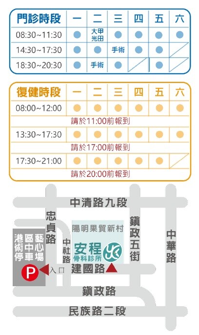 【門診止掛時間公告】 為維護醫療品質,本診所門診止掛時間為: 🔹 早診 11:00 🔹 午診 17:00 🔹 晚診 20:00 請於止掛時間前完成掛號,謝謝您的配合。 —— 安程骨科診所