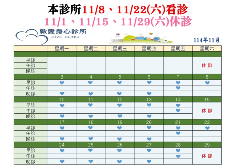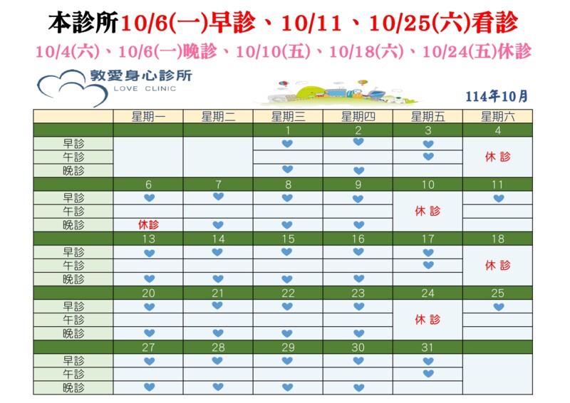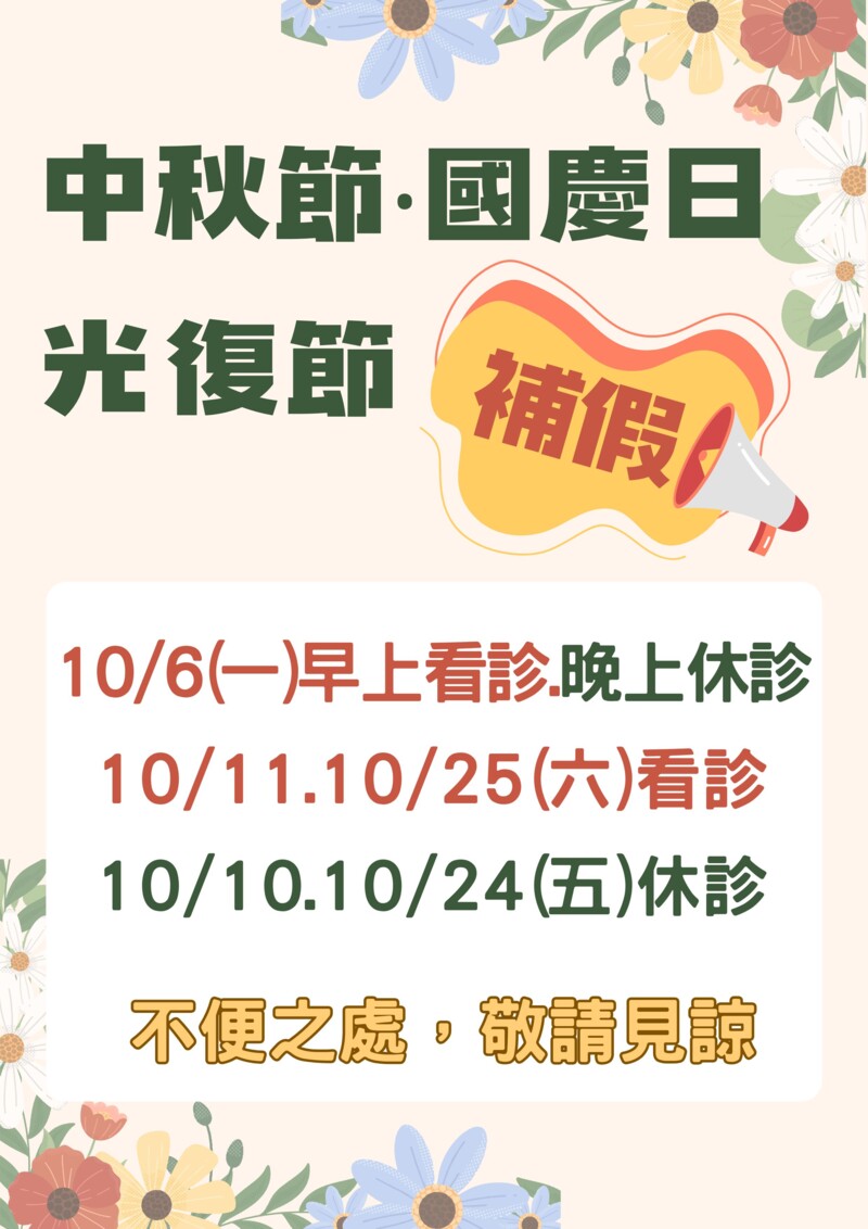 10/4(六)、10/6(一)晚診、10/10(五)、10/18(六)、10/24(五)休診