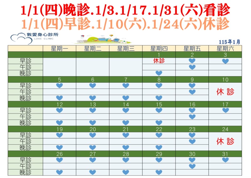 1/1(四)早診.1/10(六).1/24(六)休診 敦愛身心診所關心您