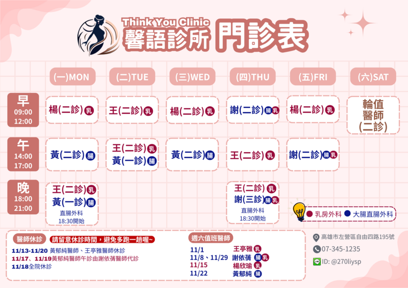 休診公告請關注【馨語診所】官方臉書帳號 門診前半小時截止掛號 本院所提供乳房超音波檢查、微創手術;大腸直腸科檢查、腸胃鏡檢查、微創痔瘡 歡迎加官方賴 @270lipsy詢問