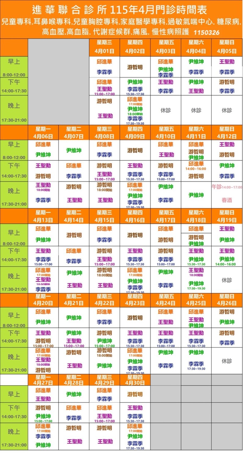 FB粉絲團 : 進華聯合診所 (FB每月更新門診表)
