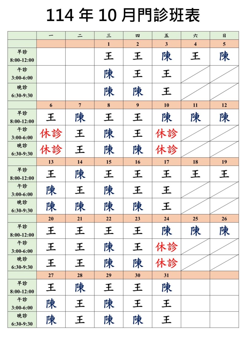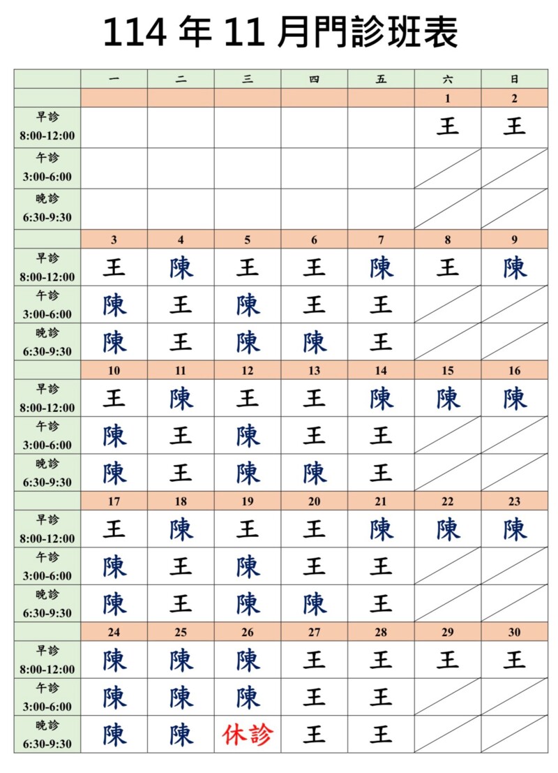 11/24(一)-11/26(三)王醫師請假由陳醫師代診。
