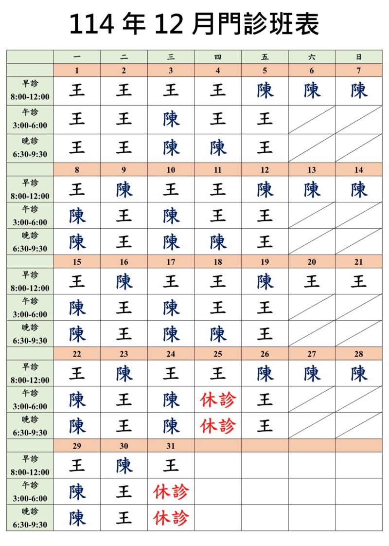 12/31(三)早上正常看診,下午晚上休診,1/1(四)元旦全日休診。