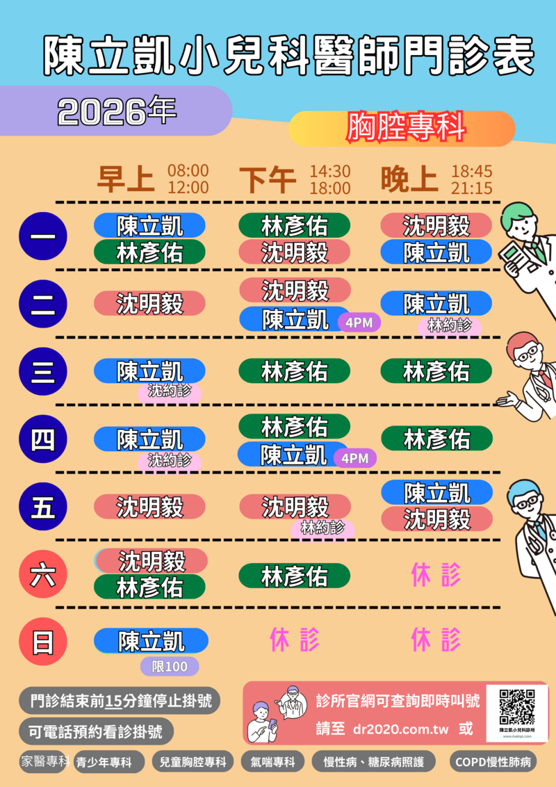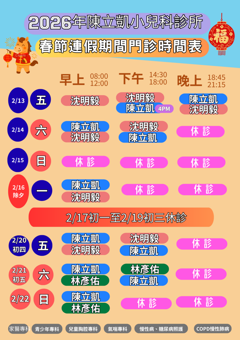 春節連續假期,初一至初三休診,詳細門診時間請看下表。 祝各位鄉親與家長闔家平安,馬年行大運