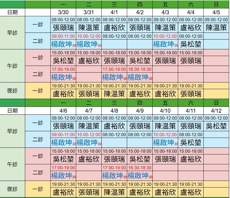 1. 楊啟坤院長門診後方數字為掛號人數上限